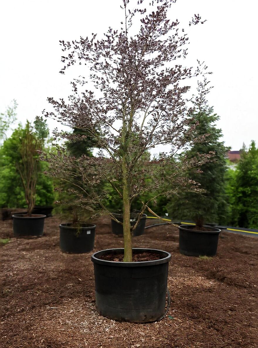 Das Laub hingegen verfügt über einen großen Zierwert und macht den kleinen Baum zu einem echten Gartenstar. Die Blätter treiben im Frühjahr aus und begrüßen das Gartenjahr mit einer intensiv roten Färbung. Das Blatt ist oval geformt und hat einen gewellten Blattrand sowie eine behaarte Unterseite. Es glänzt wunderschön im Sonnenschein und belebt den Garten mit seiner frischen Erscheinung. Im Sommer strahlt es schließlich in einem markanten Schwarzrot, die einzelnen Blättchen werden von dann einem rosafarbenen Blattrand umrahmt. Die ungewöhnliche Blattfärbung macht den Baum zu einem echten Blickfang, der jeden Garten aufwertet und wunderschöne Naturimpressionen schafft.
