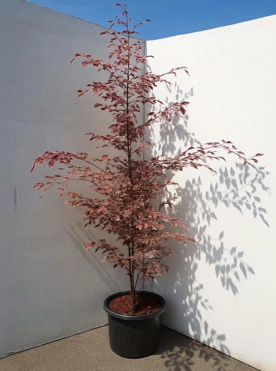 Fagus sylvatica ’Tricolor‘ ist eine sehr alte Züchtung der sogenannten Rotbuche und wurde mutmaßlich im Jahr 1873 in Frankreich selektiert. Sie begeistert mit einem wunderschönen Blattwerk, das im Verlaufe des Gartenjahres ein sinnliches Farbenspiel vollzieht und den Baum zu einem echten Schmuckstück macht. Im Austrieb zeigt sich das Blatt rötlich glänzend, um dann im Sommer rotschwarz mit einem markanten rosafarbenen Rand zu leuchten. Im Herbst färben sich die Blätter schließlich in warmen Nuancen von Gelb sowie Orange und vervollständigen das atemberaubende Farbenspiel. In Kombination mit ihrem malerischen Wuchs ist die Züchtung ’Tricolor‘ eine echte Gartenschönheit und verleiht selbst dem Privatgarten einen Hauch von Extravaganz.