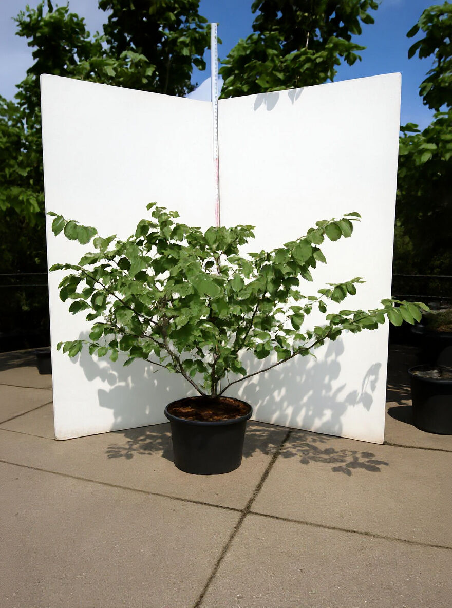 Hamamelis intermedia 'Pallida' (Zaubernuss) 125–150 cm, C50, mehrstämmiger Strauch im Container mit grünem Laub.