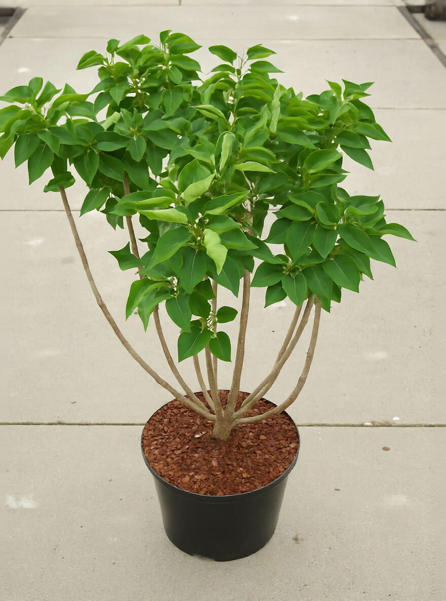 Syringa vulgaris 'Michel Buchner' (Gartenflieder) im Topf, mehrstämmiger Strauch mit grünem Laub, 60–80 cm, C7