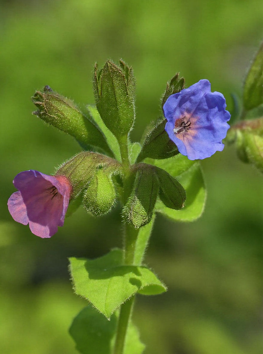 Pulmonaria saccharata 'Reginald Kaye' (Lungenkraut) mit rosa und blauer Blüte sowie grünen, behaarten Knospen am Stiel