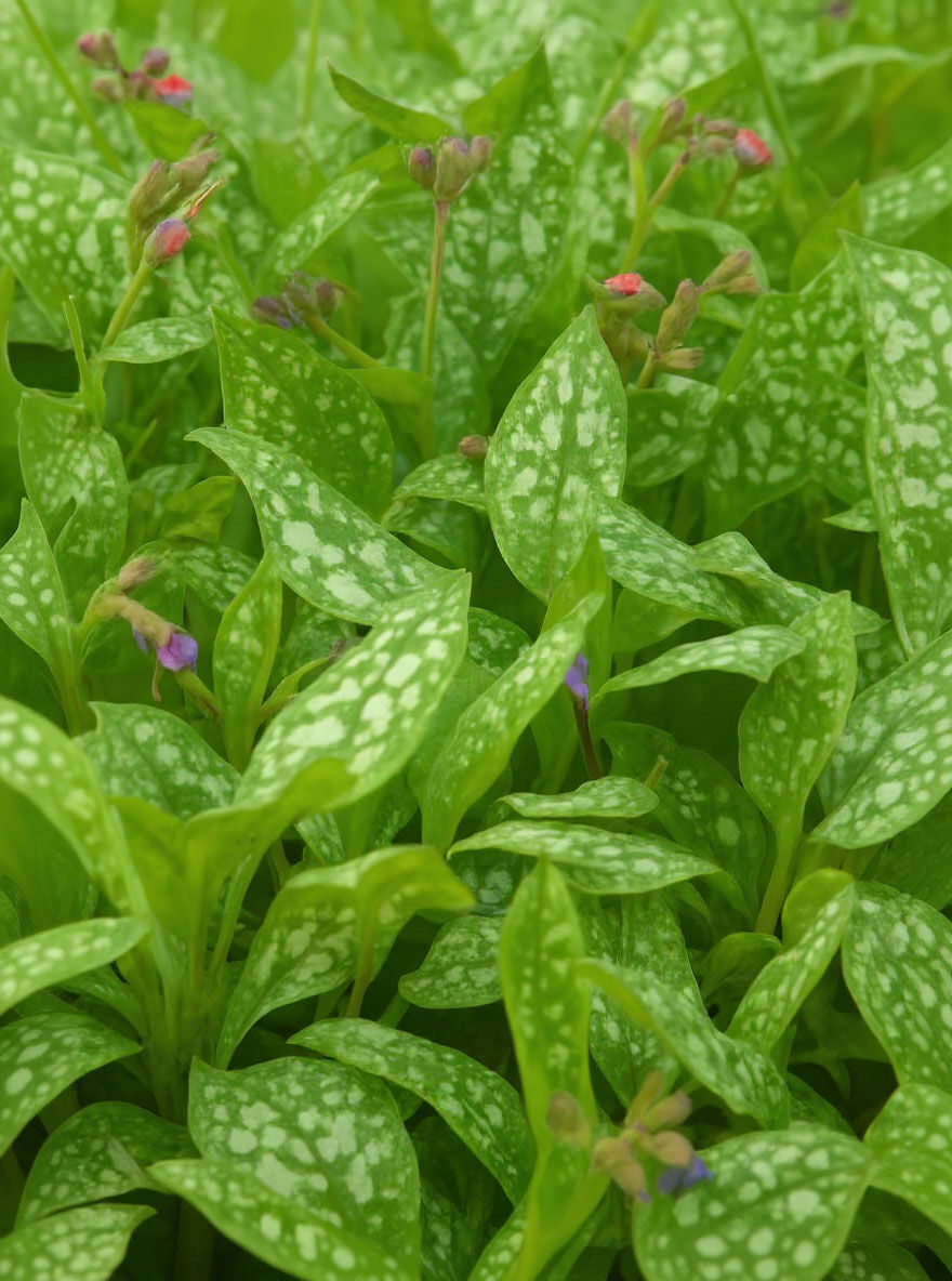 Garten-Lungenkraut Pulmonaria saccharata 'Reginald Kaye' mit grünem, silbrig geflecktem Laub und Knospen in Rosa und Blau
