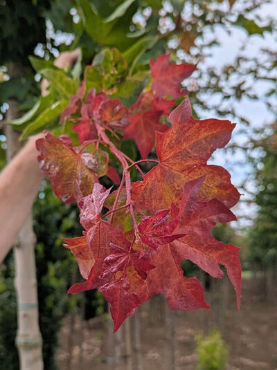 | Blatt: | Sommergrün, 5 lappig, von rotviolett bis gelbgrün, Herbstfarbe gelb, 8 bis 14 cm. |