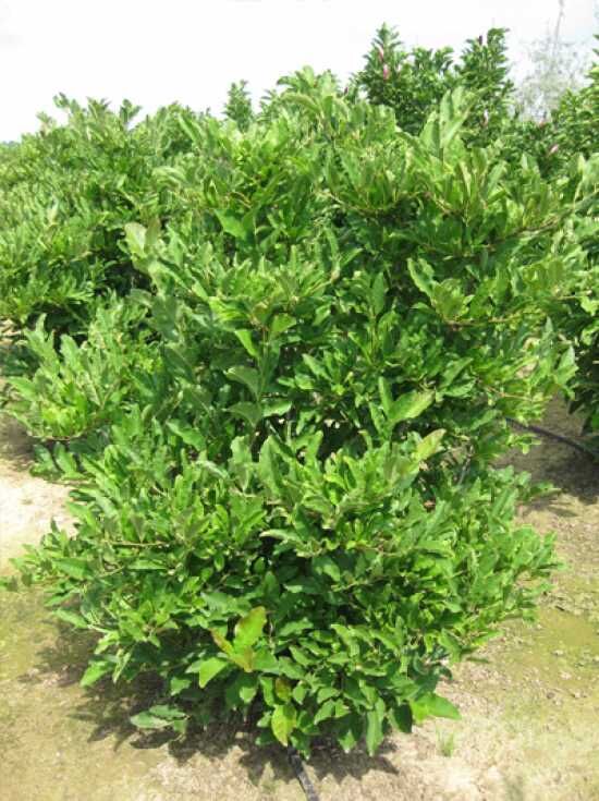 Magnolia loebneri 'Merrill' / Große Stern-Magnolie 'Merrill', junger Strauch im Pflanztopf mit grünem Laub, mehrtriebig gewachsen.