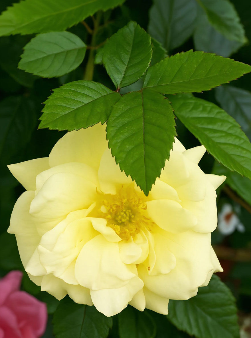| Blüte: | Leuchtend gelb, halbgefüllt, in Dolden stehend, leicht duftend, öfterblühend, 5 bis 10 cm groß. |