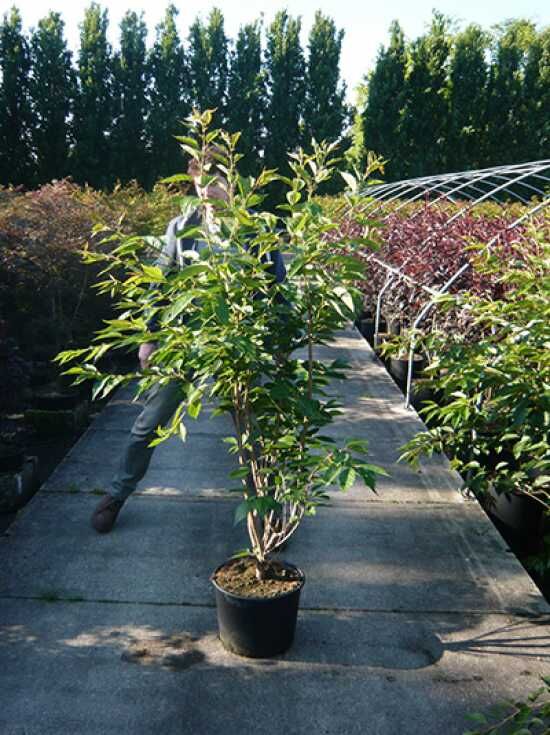 | Wuchs: | Kleiner Baum oder großer Strauch, trichterförmige Krone, straff aufrecht wachsende Hauptäste, Zweige leicht überhängend, bis zu 8 m hoch und 5 m breit. |
