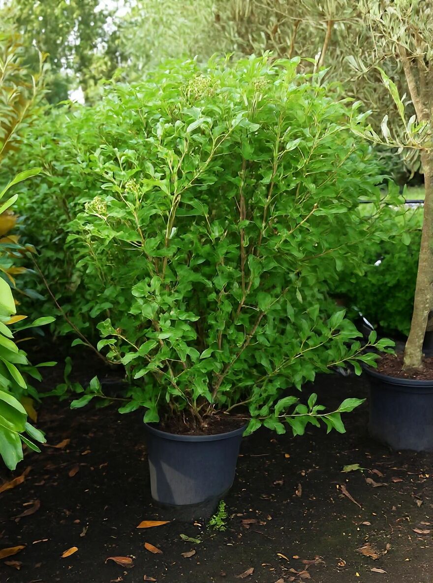 | Blüte: | Weiße Blüten in endständigen Schirmrispen, Knospen rosafarbend |
