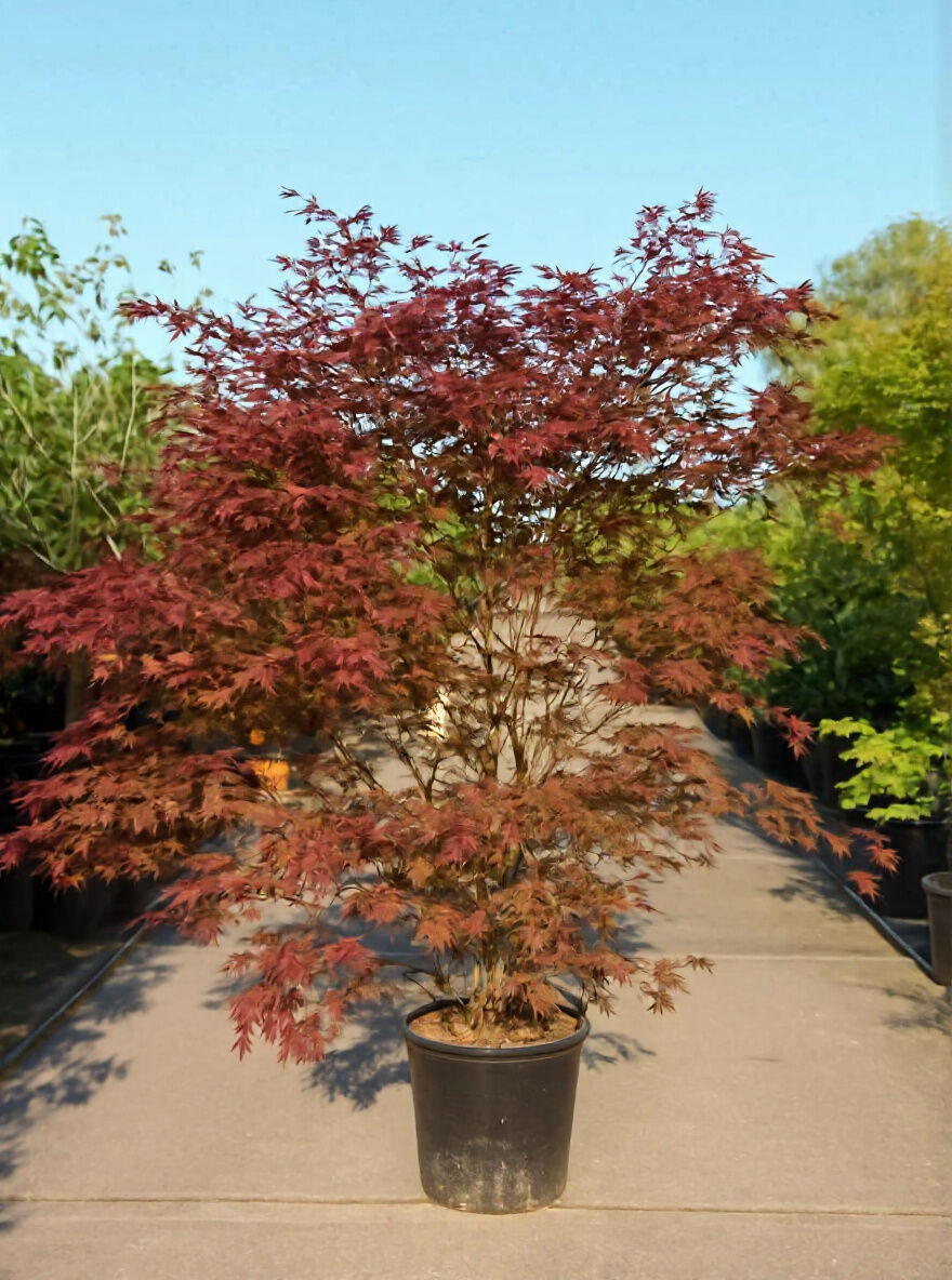 Kork-Ahorn Acer palmatum 'Arakawa', Japanischer Fächer-Ahorn im Topf C50, 175–200 cm, mit rötlichem Laub.