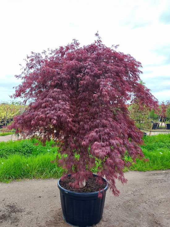 Fächer-Ahorn Acer palmatum 'Inaba shidare' 175-200 cm C200, rotes, überhängendes Laub im Container auf Baumschulfläche