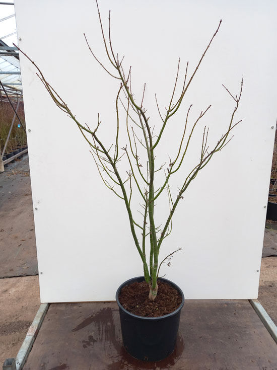 Löwenkopf-Ahorn (Acer palmatum 'Shishigashira' / 'Cristatum') als junger, unbelaubter Baum im Pflanztopf.