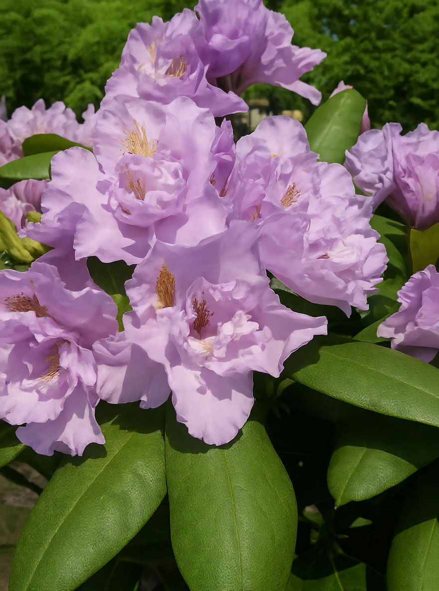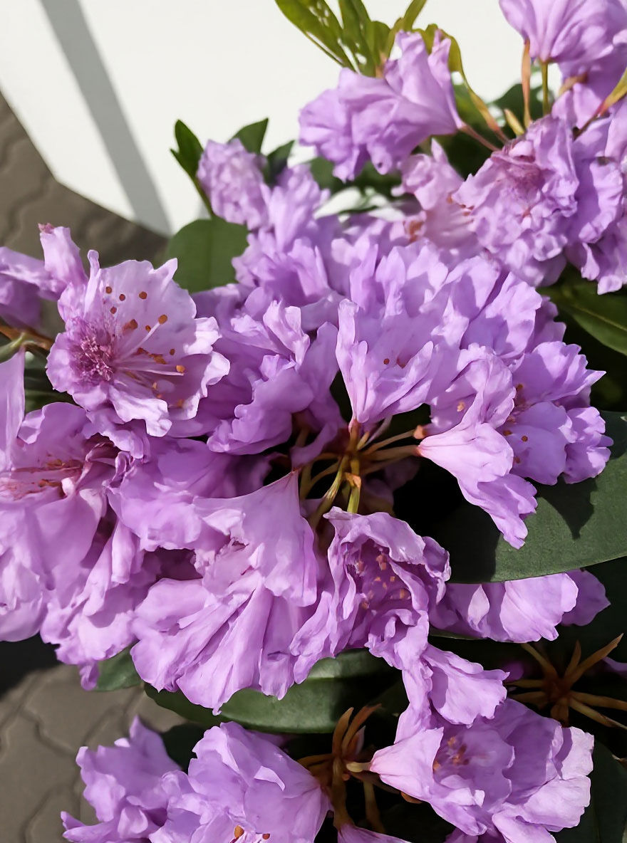 Der Rhododendron Hybride 'Fastuosum Flore Pleno' ist bekannt für seine beeindruckenden und zahlreichen Blüten, die über den Mai in voller Pracht erstrahlen. Die Blüten sind dicht gefüllt und haben eine wunderschöne fliederfarbene Optik mit bronzefarbener Zeichnung. Sie können bis zu 8 cm groß werden und bilden gemeinsam einen imposanten Blütenstand.