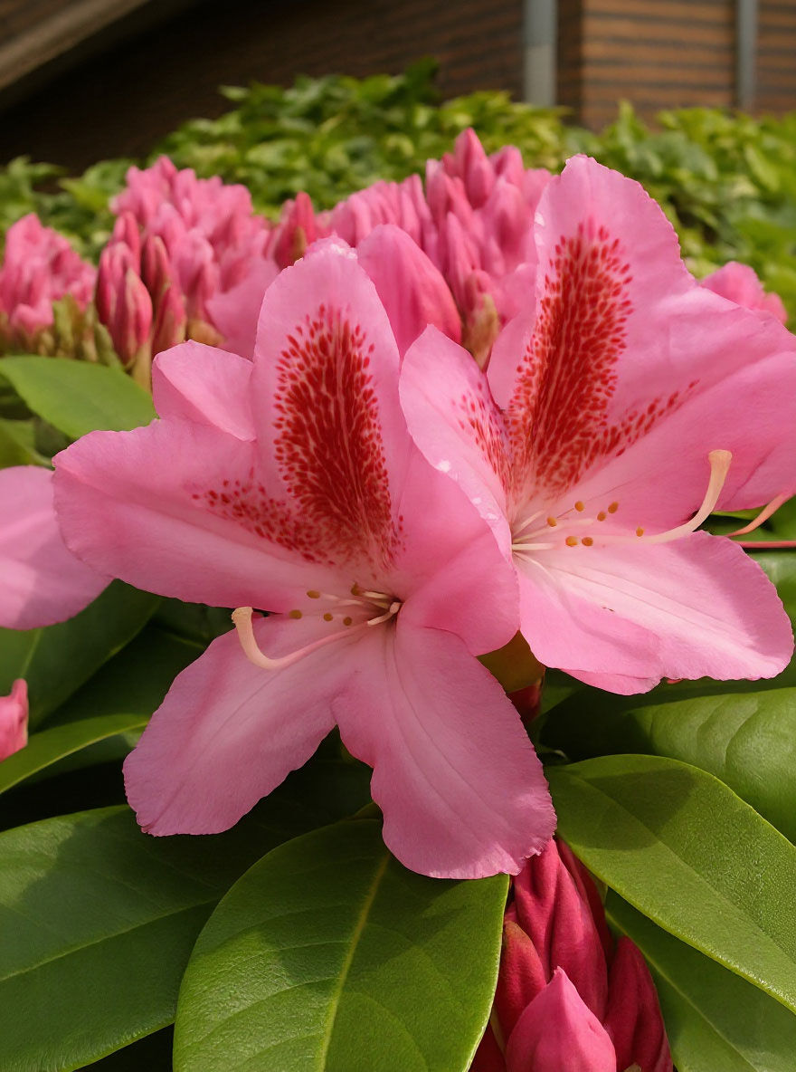 Die Blüten des Rhododendron Hybride 'Furnivall's Daughter' sind das Highlight dieser Pflanze. Sie sind groß und trichterförmig mit einer kräftigen, rosa Farbe und dunkelroter Zeichnung. Die Blütezeit dieser Hybride ist im späten Frühling oder frühen Sommer, je nach Region und Witterung. Die Blüten erscheinen in dichten Trauben und können bis zu 7,5 cm groß sein.