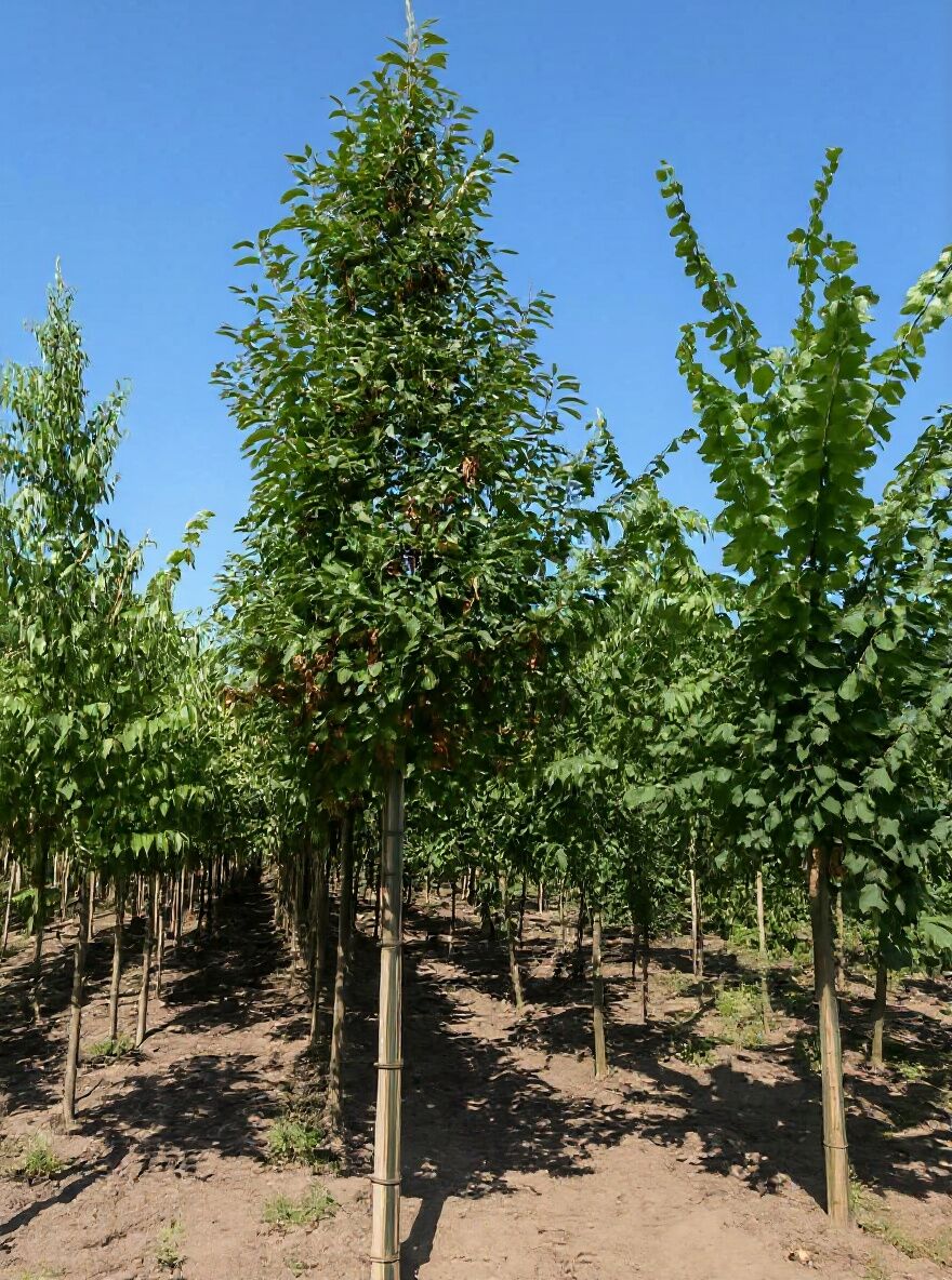 | Blatt: | Sommergrün, eiförmig, am Ende zugespitzt, gezahnter Rand, im Austrieb bronzefarben, später grün, 8 bis 10 cm lang. |