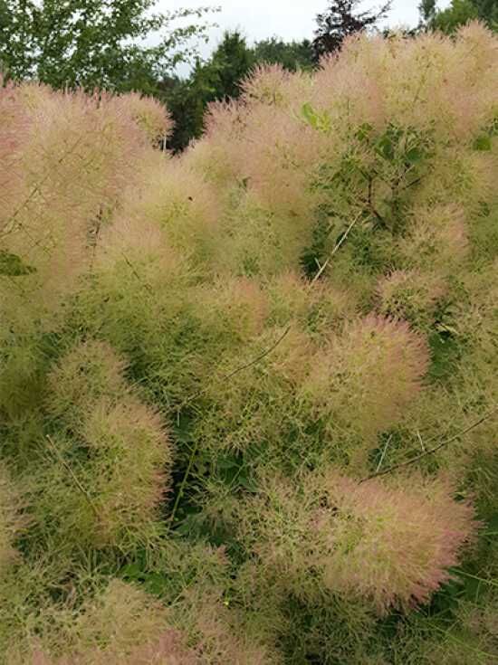 Cotinus coggygria (Gewöhnlicher Perückenstrauch) mit zahlreichen, lockeren, perückenartigen Fruchtständen in Rosa und Beige am Strauch