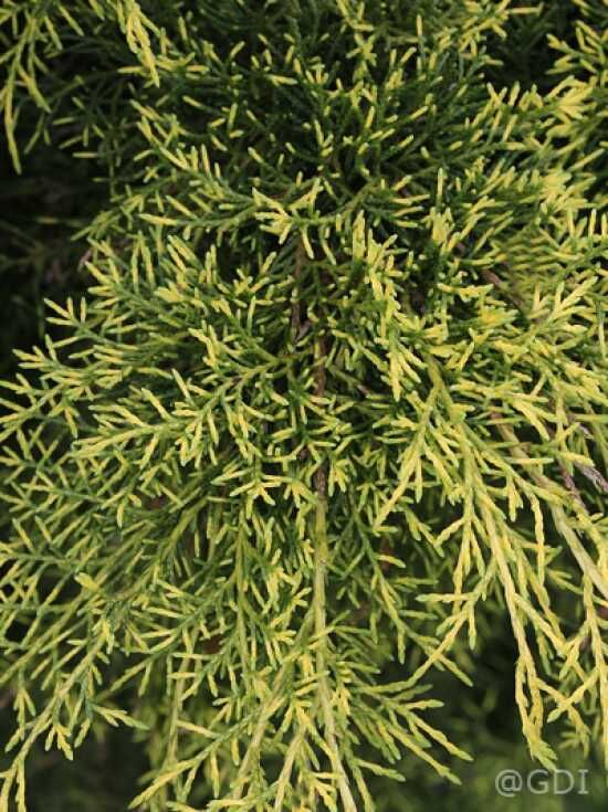 Blatt: Immergrün, goldgelbe Nadeln, extrem dicht anliegend, schuppenförmig.
