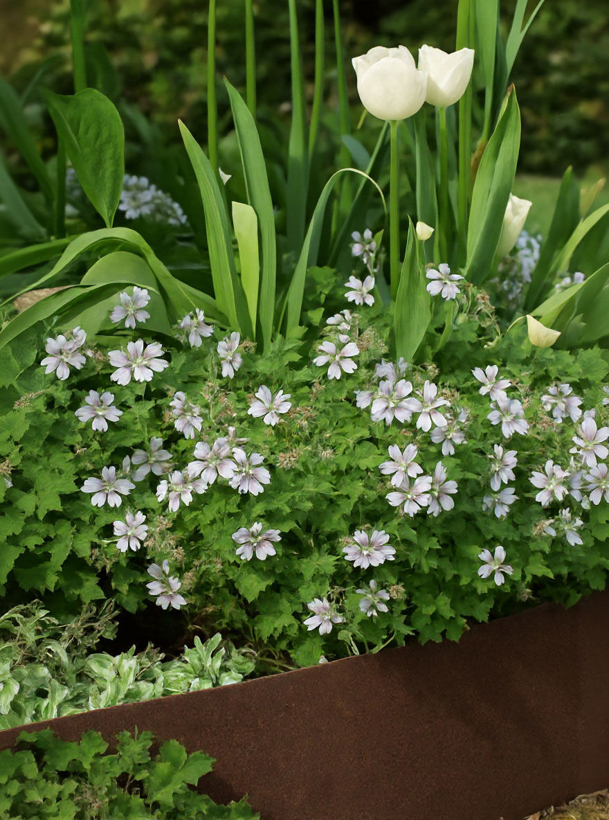 | Eigenschaften: | Der Geranium renardii (Kaukasus-Storchschnabel) ist eine besondere Blattschmuckstaude, die sich alsanspruchslos, pflegeleicht und gut winterhart erweist. Starker Frost kann ihr kaum etwas anhaben. Der Storchschnabel erreicht trotz der kleinen Blüte eine große Wirkung. Gerade in Gruppen gepflanzt, wirkt die Bodendeckerstaude schön, da die kissenartig über den Untergrund wächst. Geeignet hierfür sind z. B. Steinanlagen oder Felssteppen. Unter Gehölzern schränkt er den Unkrautwuchs ein. Die Staude benötigt kaum Pflege und Aufmerksamkeit. Pflanzen Sie 10 bis 12 Stück auf einen Quadratmeter in die Sonne und achten auf einen leicht trockenen Boden. Entfernen Sie verblühte Stängel, um eine erneute Blüte zu begünstigen. |