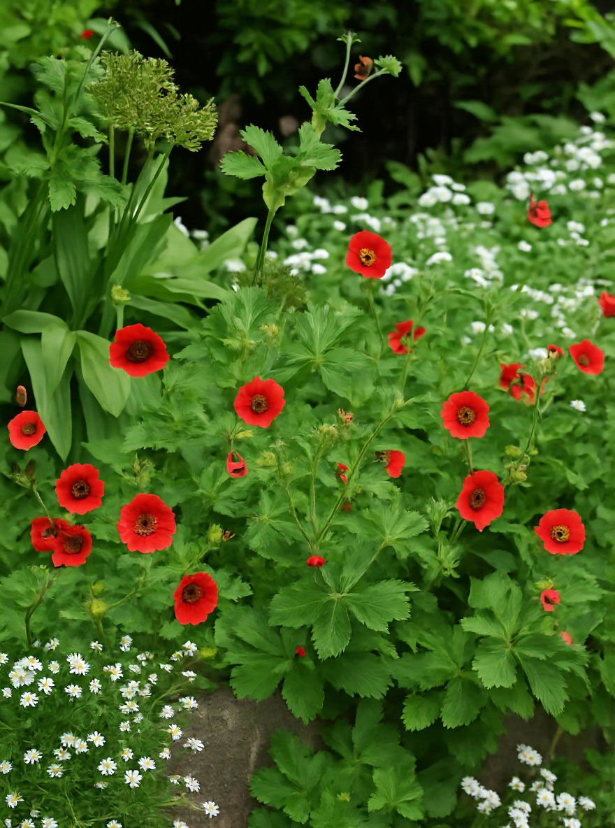 Das Pontentilla 'Gibson's Scarlet' (Garten-Fingerkraut) erstrahlt den Sommergarten mit leuchtenden, roten Blütenköpfen. In der Mitte ist die Blüte schwarz und erinnert daher von Weiten an Mohn....