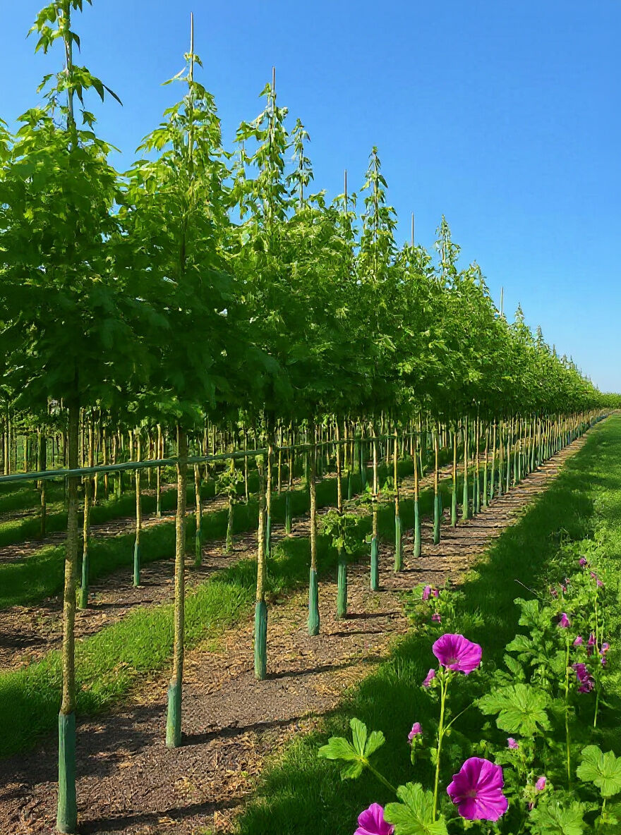 Liquidambar styraciflua 'Lane Roberts' – Amberbaum 'Lane Roberts' Hochstamm, Reihe junger Bäume in der Baumschule