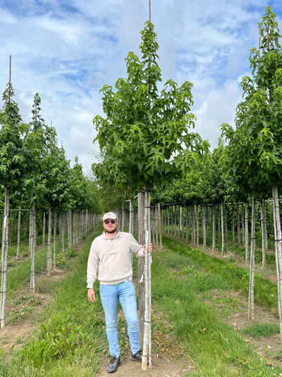 Liquidambar styraciflua 'Lane Roberts' / Amberbaum 'Lane Roberts' Hochstamm, schlanker Stamm mit Krone im Feldanbau