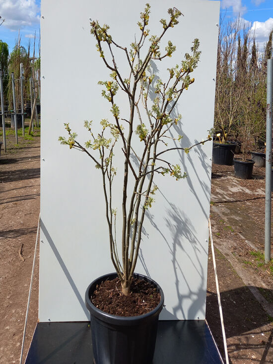 | Wuchs: | Großer Strauch oder kleiner bis mittelgroßer Baum, oft mehrstämmig, anfangs offene und runde Krone, später breit-schirmförmige Krone, 5 bis 8 m hoch und 4 bis 6 m breit. |