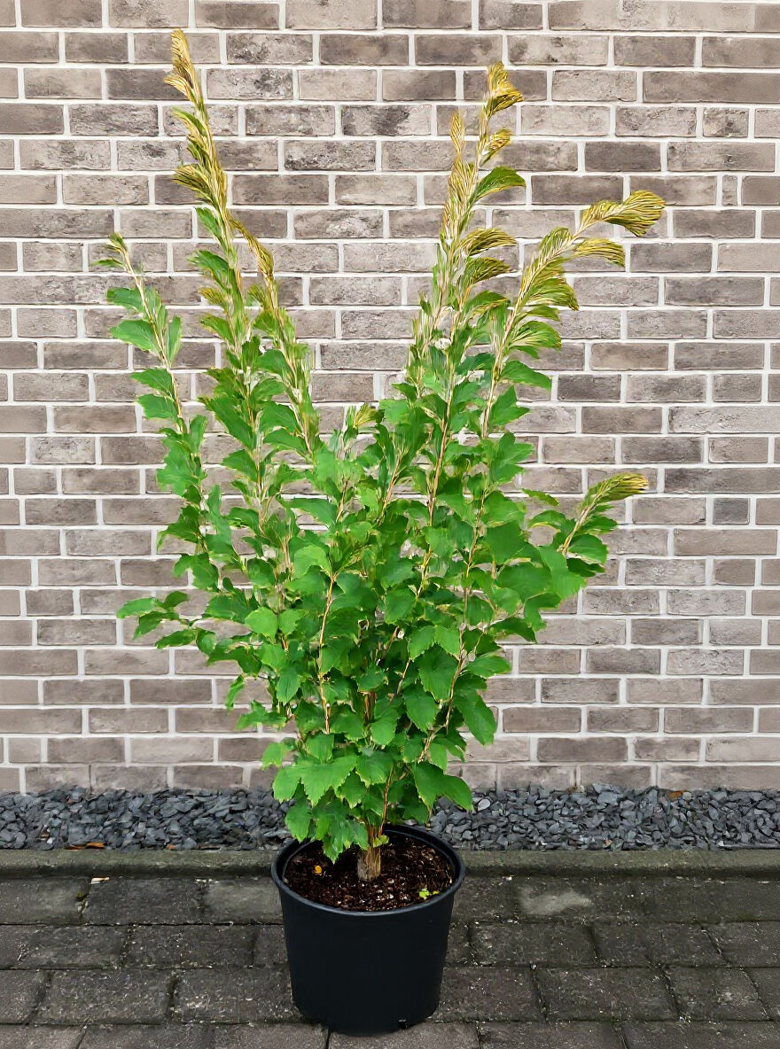 Rote Zaubernuss Hamamelis intermedia 'Feuerzauber' 125-150 cm C20, mehrtriebiger Strauch im schwarzen Pflanztopf mit grünem Laub.