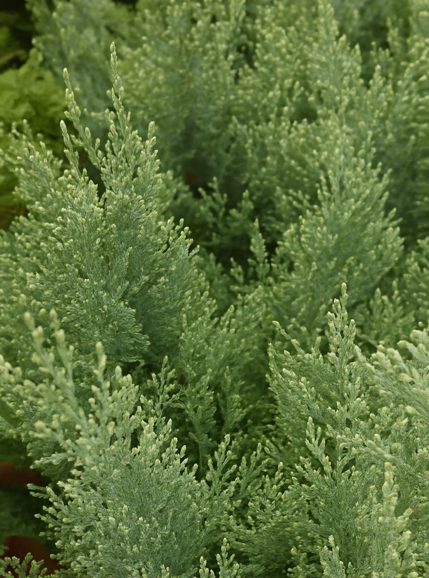 Scheinzypresse (Chamaecyparis lawsoniana) 'White Spot' mit dichtem, graugrünem Nadelwerk und hellen Triebspitzen.