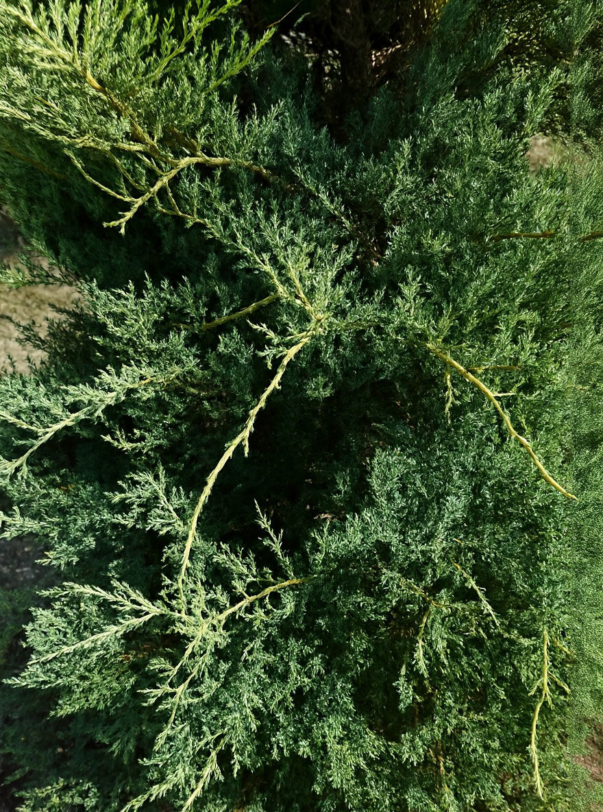 | Blatt: | Immergrün, nadelartig bis schuppenförmig, im Austrieb stahlblau, dann blaugrün, aromatisch duftend, ca. 2 cm lang. |