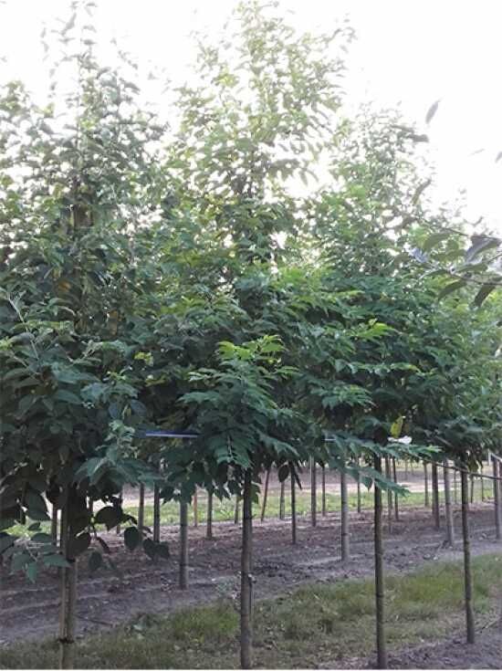 Das Blatt des Baums treibt im Frühjahr aus und strahlt in einem belebenden, satten Grün. Die Blättchen werden circa 15 Zentimeter lang und sind elliptisch. Sie haben ein zugespitztes Blattende sowie einen gesägten Blattrand und machen die Krone zu einem strahlenden Gartentraum, der Frische und Lebendigkeit ausstrahlt.