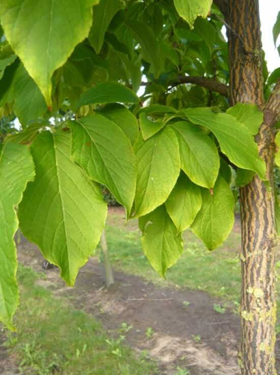 Blatt: Sommergrün, elliptisch, am Ende zugespitzt, gesägter Rand, frischgrün, im Herbst gelbgrün, 8 bis 16 cm lang.