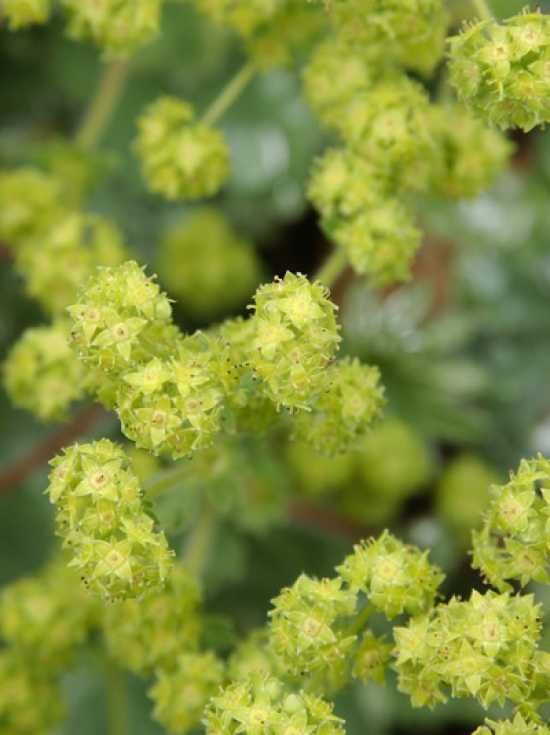 Kleiner Frauenmantel 'Senior' (Alchemilla erythropoda) mit grün-gelben Blütenständen und rundlichen, gelappten Blättern in Nahaufnahme.
