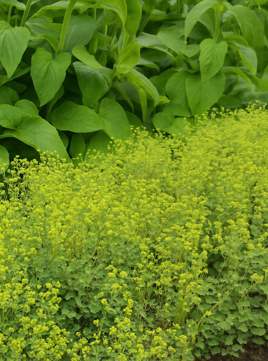Kleiner Frauenmantel (Alchemilla erythropoda) 'Senior' mit grünem, gelapptem Laub und gelbgrünen Blütenständen in Bodendecke.