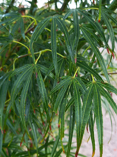 | Blatt: | Sommergrün, fingerartig, schmal-länglich, sehr filigran, am Ende zugespitzt, im Austrieb gelbgrün, dann dunkelgrün, Herbstfärbung gelborange-rot, 5 bis 10 cm groß |