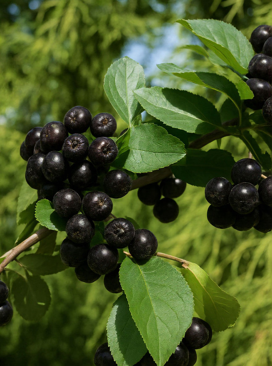 | Frucht: | Violett-schwarze Beeren, rundlich, erbsengroß, süßlich im Geschmack, zum Verzehr geeignet, zahlreich |