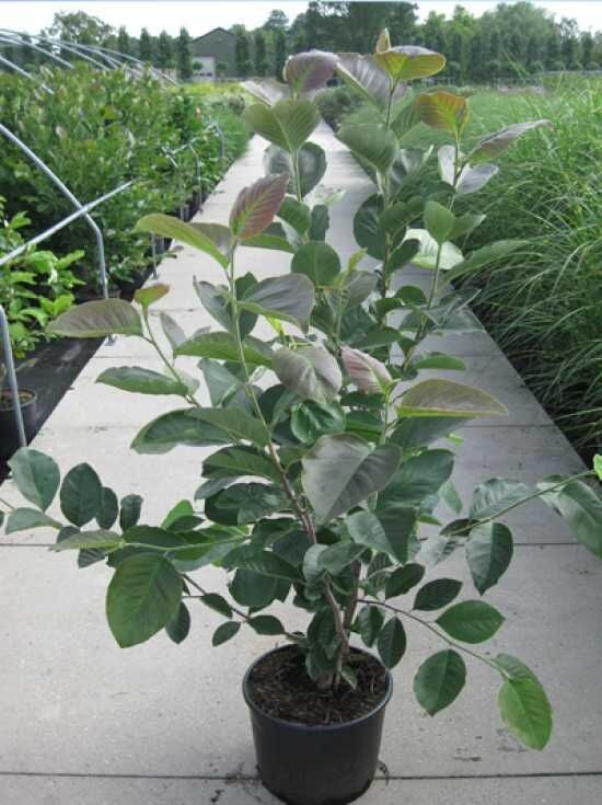 | Blatt: | Sommergrün, eiförmig bis elliptisch, am Ende zugespitzt, im Austrieb bronzerot, dann mittel- bis dunkelgrün, bis zu 12 cm lang |