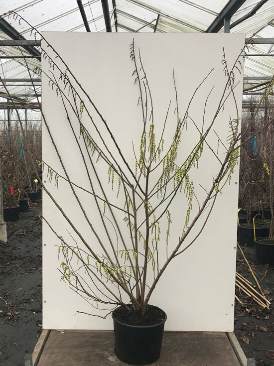 | Eigenschaften: | Der Stachyurus praecox (Japanischer Perlschweif) gehört zu den Frühjahresblühern und überzeugt den Betrachter vor allem durch die hellgelben, herabhängenden Blüten. Ein tolles Zierelement, das sowohl im Solitärbereich als auch in Kombination mit anderen Gehölzen zur Geltung kommt. Zudem entwickelt das Laub des Japanischen Perlschweifs eine wunderschöne orangegelbe bis rotbraune Herbstfärbung. Aufgrund seiner Frostempfindlichkeit sollte ein geschützter Standort ausgewählt werden. |