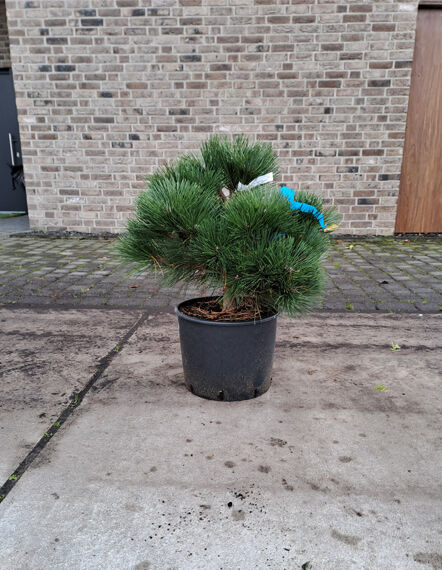 Pinus nigra 'Helga' / Zwerg-Schwarzkiefer 'Helga' als kompakte, buschige Kiefer im Pflanztopf mit grünen Nadeln.