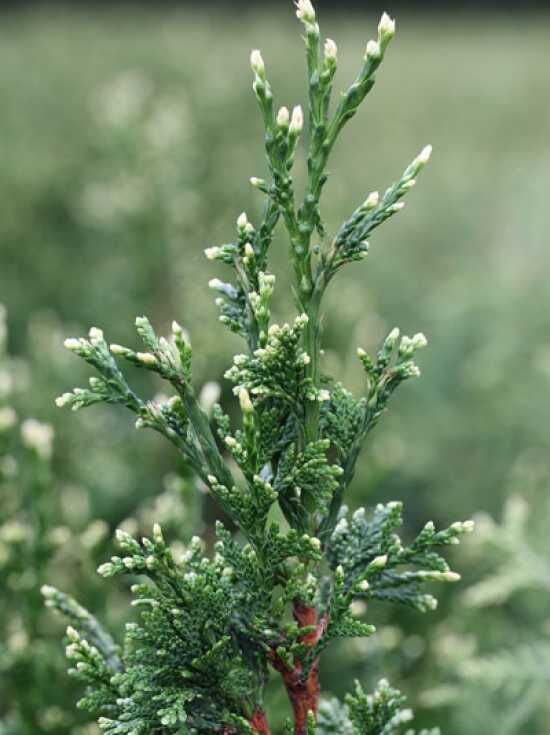 | Blatt: | Immergrün, schuppenförmig, glänzend, dunkelgrün, mit gelben bis cremefarbenen Triebspitzen |