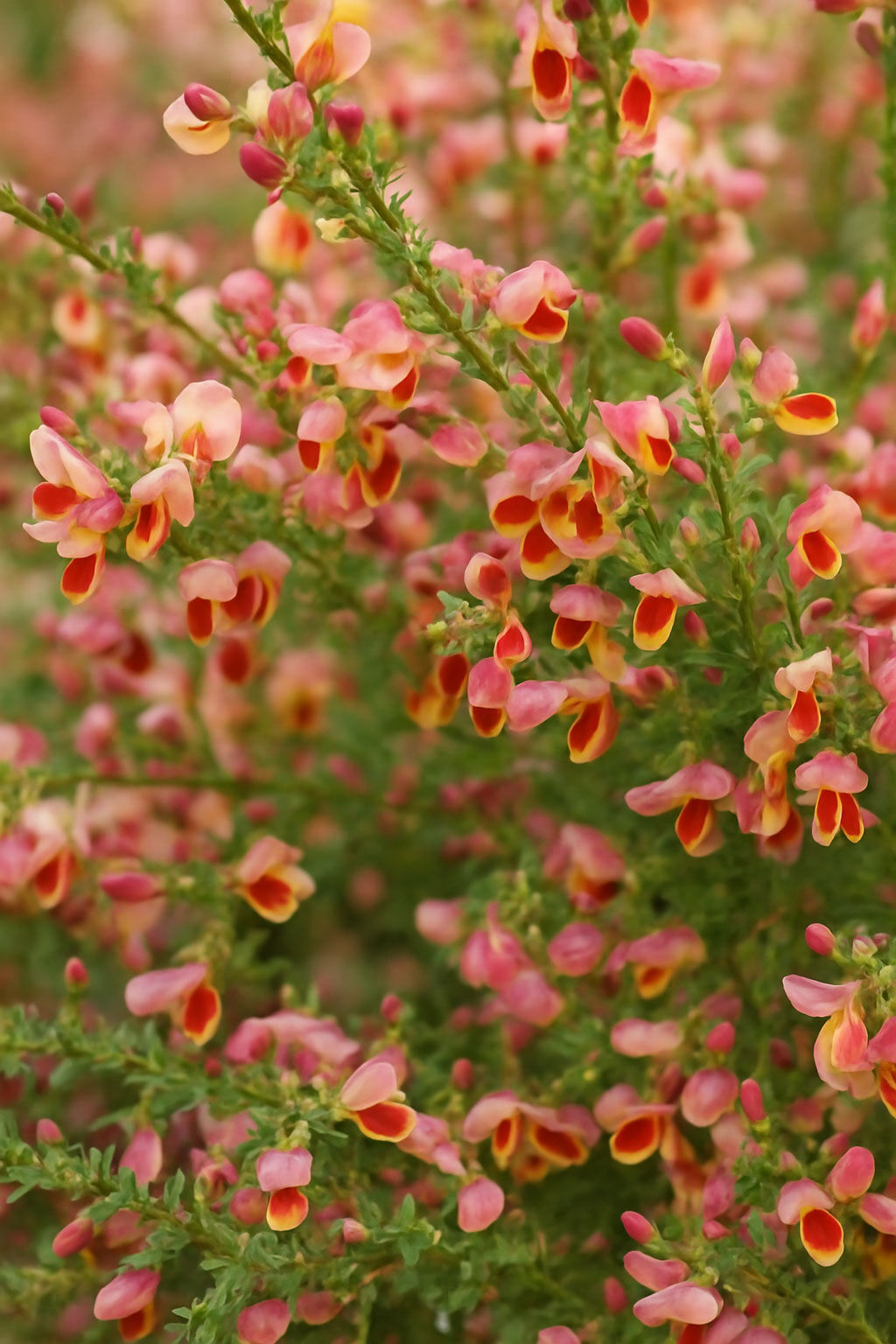 | Blüte: | Schmetterlingsblüte, rotrosa-gelb, leicht duftend, reichblühend |