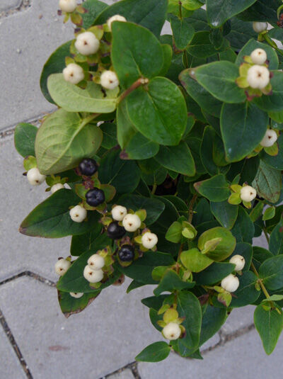 | Frucht: | Beeren, rundlich, weiß, auffallend und zierend, September bis Dezember, zur Fruchtreife schwarz. |