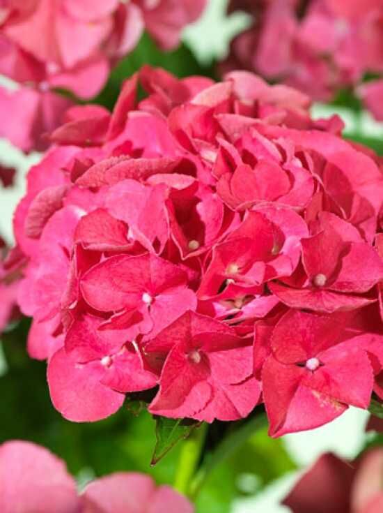Die Hydrangea macrophylla 'Masja' / Bauern-Hortensie 'Masja' ( 'Sibilla') begeistert durch ihre tolle rote Blütenpracht. In der Blühzeit auf eine ausreichende Wässerung achten. Häufig als...