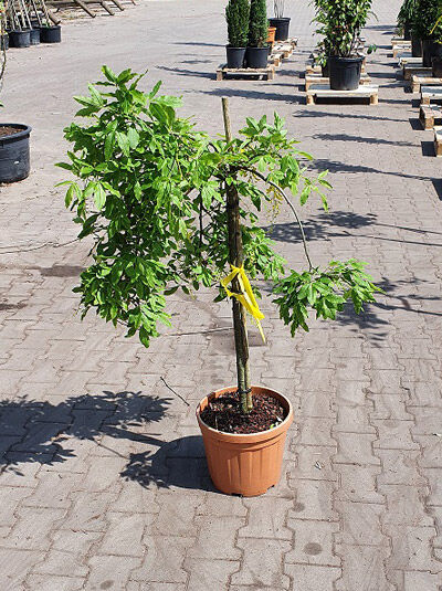| Detaillierte Beschreibung: | Herkunft und Besonderheiten des Hänge-Goldregens / Laburnum alpinum ’Pendulum‘Die Selektion Laburnum alpinum ’Pendulum‘ ist eine beliebte Züchtung des sogenannten Alpengoldregens und wird bevorzugt als Ziergehölz für den Privatgarten genutzt. Der Urtyp der Selektion ist in den europäischen Gärten eher weniger anzutreffen, die Selektion ’Pendulum‘ hingegen gilt als äußerst populär und hat viele Bewunderer. Kombination aus Trauerform und Blütenpracht ist einmaligDer wunderschöne Baum überzeugt mit einem romantischen Charme, der durch eine malerische Trauerform und eine beeindruckende Blütenbildung im Frühjahr erzielt wird. Laburnum alpinum ’Pendulum‘ gilt Highlight unter den blühenden Gartengehölzen und steht in keinerlei Konkurrenz zu anderen Ziergehölzen. Urtyp ist ein Gewächs der BergeEntsprechend seines Namens ist der Urtyp Laburnum alpinum in den Gebirgsregionen Frankreichs, Italiens und Österreichs beheimatet und dort in freier Natur anzutreffen. Er ist ebenso in den Pyrenäen, in Ungarn, Tschechien und der Slowakei zu finden und hat sich drüber hinaus in Teilen der deutschen Mittelgebirge angesiedelt. Alpengoldregen zeigt große Ähnlichkeit zum Gemeinen GoldregenNeben seinem Verwandten, dem Gemeinen Goldregen, gehört der Alpengoldregen zu Gattung der Laburnum / Goldregen in der Familie der Fabaceae. Im Gegensatz zum Gemeinen Goldregen ist der Alpengoldregen aber sensibler bezüglich Trockenheit und benötigt einen geschützten Standort. Der Hänge-Goldregen verzaubert mit romantischem Charme und zartem DuftAlle Selektionen des Goldregens haben eine lange Tradition als Zierelement und wurden bereits vor vier Jahrhunderten kultiviert. Der wunderschöne Goldregen ist mit seiner überschwänglichen Blüte an Schönheit nicht zu übertreffen und daher in Gesamteuropa sehr verbreitet. Er vermag es, jedem Garten einen Hauch von Romantik zu verleihen und erweist sich zudem als recht pflegeleicht. Die Selektion des Hängenden Goldregens überzeugt darüber hinaus mit einem zarten, angenehmen Dufterlebnis, das jedem Garten ein himmlisches Aroma beschert. Malerischer Wuchs durch bogig hängende ÄsteDer Großstrauch oder kleine Baum erreicht mit einem Zuwachs von circa 25 cm pro Jahr eine recht Endhöhe von bis zu 6 Metern. Er wird mit einem Ausmaß von bis zu 4-5 Metern ähnlich breit wie hoch und sollte daher ausreichend Raum erhalten, um sich formschön entwickeln zu können. Seine Krone wächst trichterförmig und endet mit bogig hängenden, ausladenden Ästen, die eine romantische Trauerform bilden und dem Baum eine fließende, leichte Optik geben. Diese verleiht dem Baum eine besonders mystische und.... |