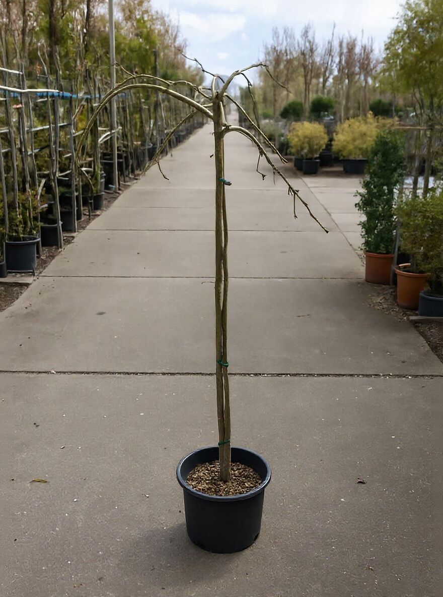 Der Großstrauch oder kleine Baum erreicht mit einem Zuwachs von circa 25 cm pro Jahr eine recht Endhöhe von bis zu 6 Metern. Er wird mit einem Ausmaß von bis zu 4-5 Metern ähnlich breit wie hoch und sollte daher ausreichend Raum erhalten, um sich formschön entwickeln zu können. Seine Krone wächst trichterförmig und endet mit bogig hängenden, ausladenden Ästen, die eine romantische Trauerform bilden und dem Baum eine fließende, leichte Optik geben. Diese verleiht dem Baum eine besonders mystische und nostalgische Aura, die Schauplatz eines romantischen Märchens sein könnte.