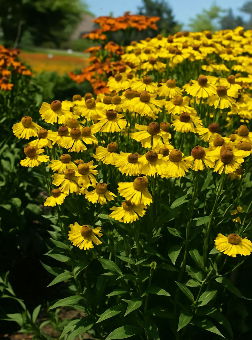 Für Bauern- oder Präriegärten ist Helenium bigelovii 'The Bishop' eine ausgezeichnete Wahl, da sie den natürlichen, wildromantischen Charakter dieser Gartentypen unterstreicht. In Bauerngärten passt sie gut zu traditionellen Pflanzen wie Rittersporn oder Phlox und trägt zur bunten Mischung bei. Im Präriegarten, der von Gräsern und trockenheitsverträglichen Stauden dominiert wird, fügt sie sich mit ihrer sonnenliebenden Art ein und bietet Insekten eine wertvolle Nahrungsquelle. Ihre unkomplizierte Pflege und die lange Blütezeit machen sie zu einem zuverlässigen Element in solchen naturnahen Gestaltungen.