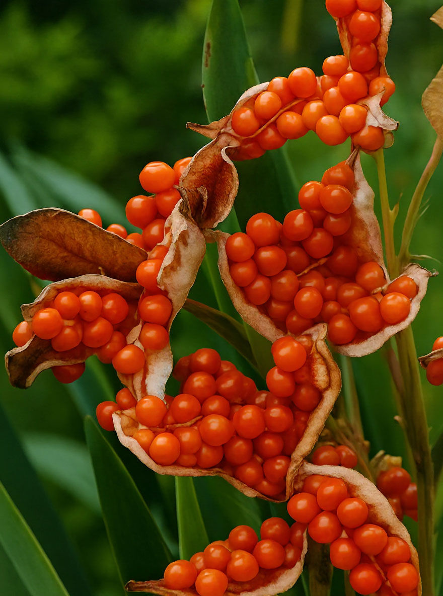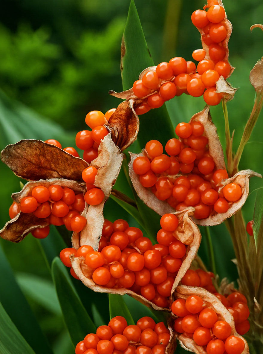 | Frucht: | Kapsel, orangerote Samen. |
