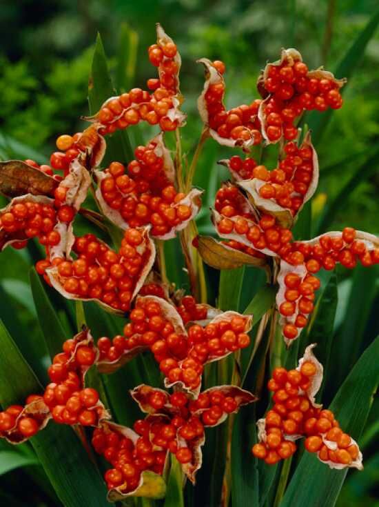 | Eigenschaften: | Die Iris foetidissima (Stinkende Schwertlilie) hat ihre Heimat in England, wo sie sich auf gut durchlässigen, trockenen bis frischen Böden ansiedelt und im Hochsommer hübsche Akzente setzt. Neben den besonderen grauen Blüten bilden vor allem die Fruchtstände der Staude, mit ihren auffälligen orangeroten Samen, einen farbigen Blickfang. Ihren optimalem Standort findet die Schwertlilie sowohl am Gehölzrand als auch auf der Freifläche. Dort ist sie sehr pflegeleicht und ergibt mit 10 Pflanzen pro Quadratmeter ein attraktives Gesamtbild |