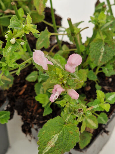 Lamium maculatum 'Shell Pink' / Taubnessel 'Shell Pink' im Topf, grüne Blätter und zartrosa Blütenstände sichtbar