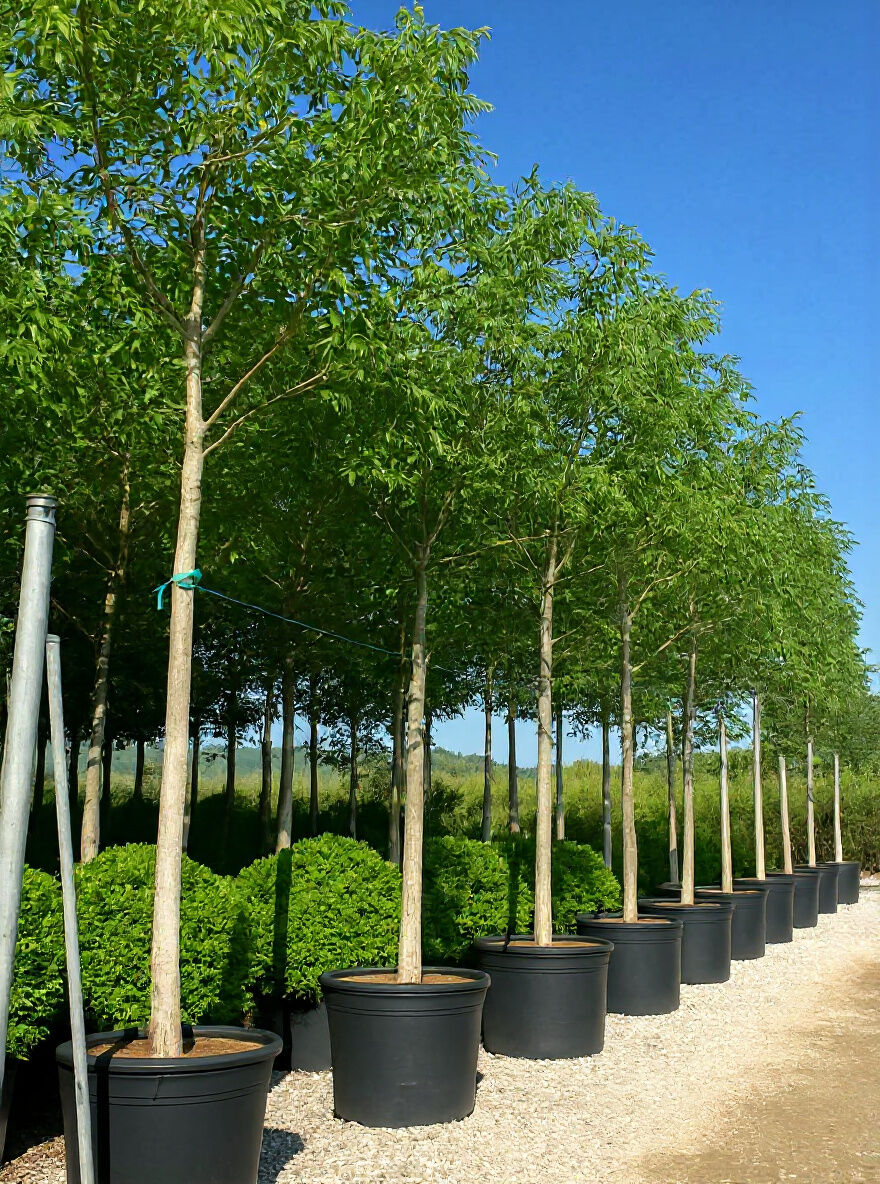 Juglans regia (Gemeine Walnuss) Hochstamm 25-30 StU im Container, Jungbaum mit geradem Stamm und grüner Krone in Reihe.