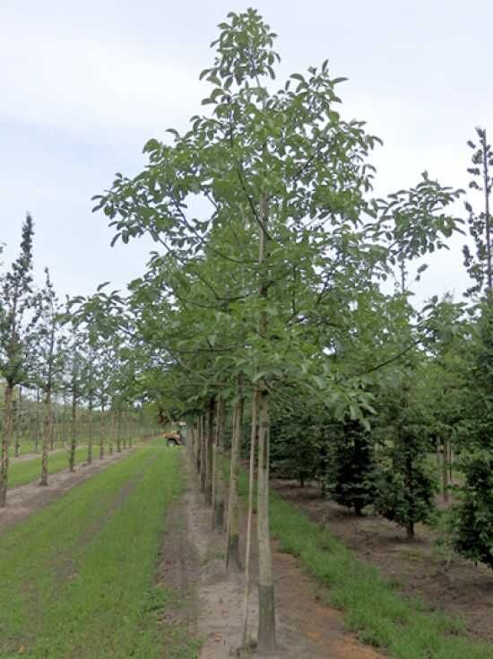 Juglans regia (Gemeine Walnuss) als junger Hochstamm mit glattem Stamm und verzweigten Kronenästen in der Baumschule
