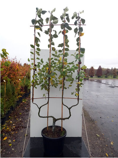 Malus domestica 'James Grieve' / Apfel 'James Grieve' Spalier doppelte U-Form C50 im Topf, mit Trieben und Blättern am Spalier.