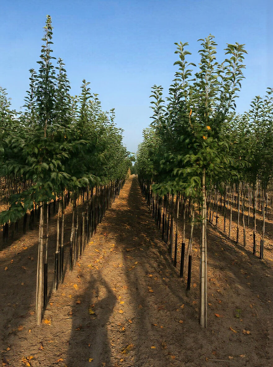Malus domestica 'Winterrambur' (Winterrambur) Hochstamm 10-12 StU mit Drahtballen, Jungbäume in Baumschulreihe